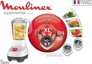 خلاط كهربائي سوبر من مولينكس، 700 وات، 2 لتر، مزود بمطحنة ومبشرة. دع الخلاط السوبر من مولينكس وملحقاته المتضمنة يتعامل مع جميع تحضيراتك ومكوناتك- بدءًا من العصائر وعصائر السموذي وحتى الشوربات والصلصات والمزيد! يتميز بشفرات قوية من الستانلس ستيل مع مادة زيلكروم الخاصة بنا، خلاط المطبخ المتين هذا مصنوع في فرنسا ومصمم ليدوم طويلاً. تتميز ملحقات المطحنة والمبشرة المصنوعة من الستانلس ستيل بأنها قوية وسهلة التنظيف وتبقى خالية من الروائح- مثالية لطحن المكسرات أو الحبوب أو التوابل ولبشر البارميزان أو الشوكولاتة أو جوز الهند. سرعتان مع وظيفة النبض تضمن الملمس المثالي المرغوب في كل مرة، بينما توفر الشفرات الأربعة القابلة للإزالة تنظيفًا سهلاً لتوفير الوقت. تقليب كل شيء بسعة كبيرة 2 لتر، مثالي للعائلة والأصدقاء، ومحرك قوي بقوة 700 وات للحصول على نتائج سريعة، وكوب قياس متضمن لسهولة المكيال من الكميات الصغيرة. لن يخذلك الخلاط السوبر: الخلاط الخبير في المطبخ.